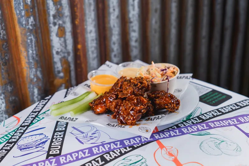 Pollo frito, queso americano, tocino crocante, lechuga, coleslaw, Pepinillos dulces, dip in de sweet buffalo y salsa rapaz. Incluye papas fritas.