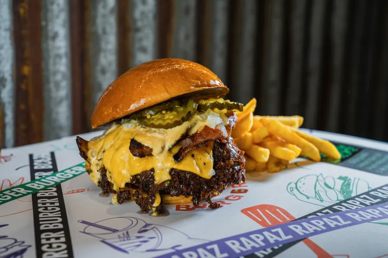 Hamburguesa smash, queso americano, salsa de queso crema, chutney tomate pimentón, crispí onion, jalapeño encurtidos y salsa de cilantro. Incluye papas fritas.